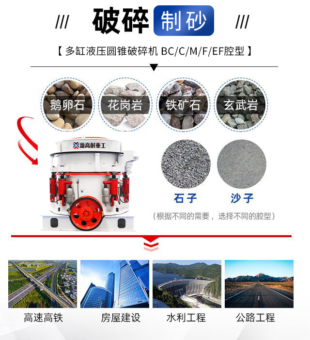 Multi-cylinder hydraulic cone crusher is suitable for crushing various ores and rocks with medium and above medium hardness, such as cobblestone, limestone, iron ore, non-ferrous metal ore, basalt, granite, limestone, quartzite and sandstone, etc., and is widely used in Mining, construction, chemicals, transportation, water conservancy and other industries can meet the crushing needs of different industries, provide high-quality crushing effects, and help various industries achieve efficient production and resource utilization. According to feedback from many customers, XHP series multi-cylinder hydraulic cone crushers from Xingaonai Heavy Industry have shown excellent performance in medium, fine and ultra-fine crushing operations.