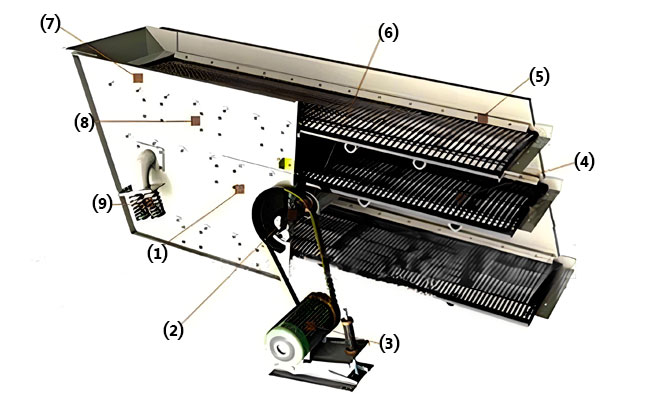 The structure of the vibrating screen is complex, usually composed of a screen box, a vibrator, a vibration damping spring device, a screen, a screen clamp, a bottom frame, etc. In addition, the structure will vary depending on the type of vibrating screen. For example, the circular vibrating screen also includes a cylindrical eccentric shaft exciter, a vibration damping spring device, a bottom frame and other components; the linear vibrating screen is composed of a screen frame, a motor pedestal, a bracket, etc.; the three-axis elliptical vibrating screen is composed of a transmission device, a damper, a bottom frame, etc.