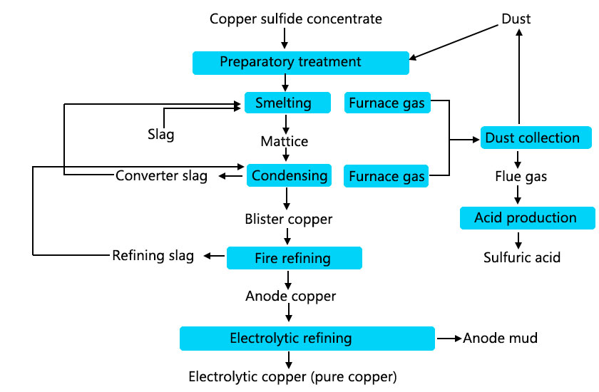 Pyrometallurgical copper smelting is to melt copper ore and flux together at high temperature, first smelting into matte and then into crude copper or directly into crude copper. Except for some operations, this method is carried out at high temperature. Pyrometallurgical copper smelting can be carried out in various different equipment, such as blast furnace, reverberatory furnace, electric furnace, flash furnace and continuous copper smelting furnace. After smelting into matte, it is blown, pyrometallurgical refining and electrolytic refining to finally obtain electrolytic copper.
