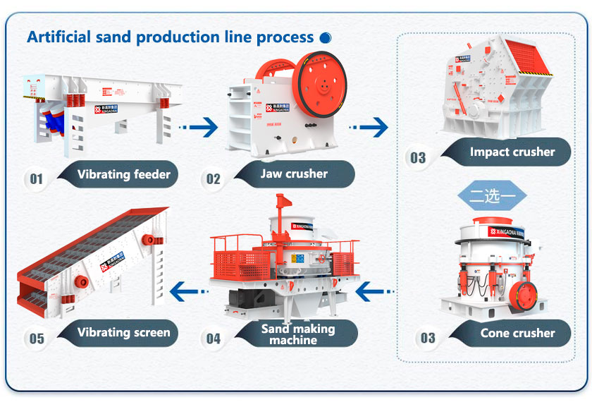 Artificial sand, also known as artificial machine sand, is sand made by machines and equipment. Usually various ore materials are used, and various large machines and equipment are used for crushing, screening, washing and other processes.