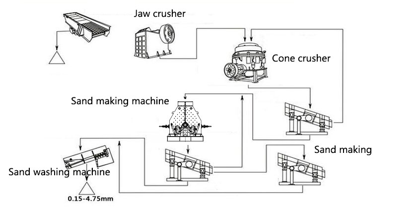 First, it is necessary to prepare the corresponding production equipment, mainly crushers, sand making machines, screening and sand washing equipment, etc. At the same time, suitable raw materials must be prepared. Generally, Goose River pebbles, limestone, granite, etc. are the main raw material ores for artificial sand. These raw materials need to go through process links such as crushing, sand making and shaping, screening and cleaning to make the corresponding artificial sand.