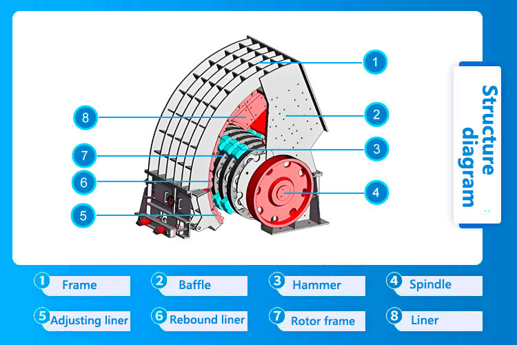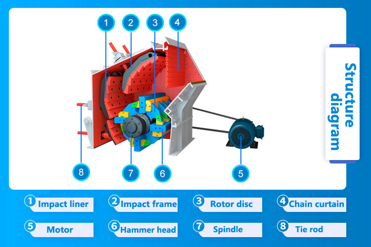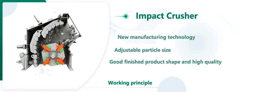 The impact crusher uses impact energy to crush materials. Driven by the motor, the rotor rotates at high speed. When the material enters the plate hammer action area, it collides with the plate hammer on the rotor and is crushed. Then it is thrown onto the impact device and crushed again, and then bounces back from the impact liner to the plate hammer action area and crushed again. This process is repeated, and the material enters the first, second, and third impact chambers from large to small and is repeatedly crushed until the material is crushed to the required particle size and discharged from the discharge port. Adjusting the gap between the impact frame and the rotor can achieve the purpose of changing the material discharge particle size and material shape;