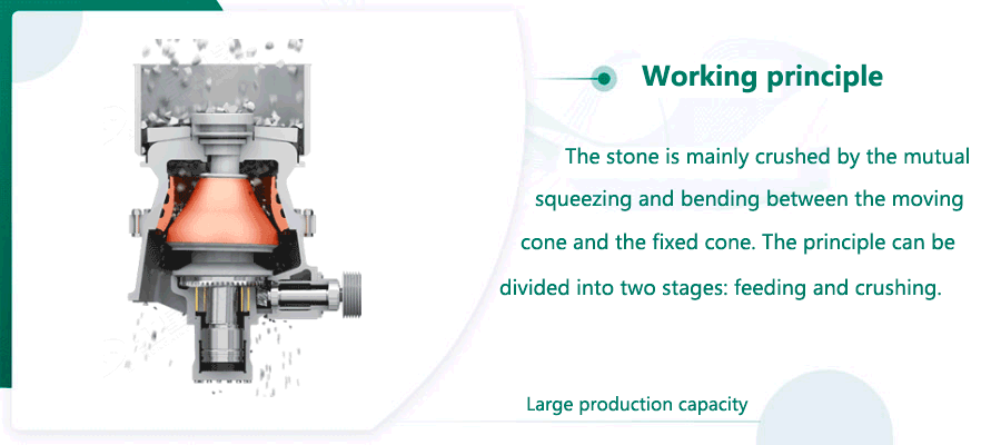 When the compound high-yield cone crusher is working, the motor drives the eccentric sleeve to rotate through the V-belt, large pulley, transmission shaft, small bevel gear, and large bevel gear. The main shaft rotates and swings under the force of the eccentric sleeve, so that the crushing wall is sometimes close to and sometimes away from the mortar wall, so that the material is constantly impacted, squeezed and bent in the annular crushing chamber composed of the fixed cone and the moving cone. After multiple extrusions, impacts and bending, the material is crushed to the required particle size and discharged from the bottom.