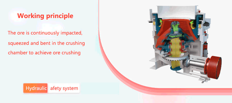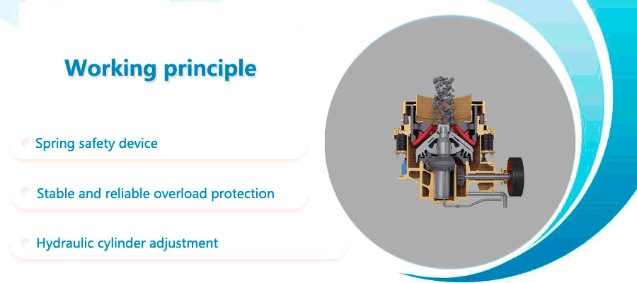 The multi-cylinder hydraulic cone crusher adopts an extrusion working principle. The motor drives the eccentric sleeve to rotate through a V-belt, a transmission shaft, and a bevel gear pair, and the moving cone performs a swivel motion driven by the eccentric sleeve. After the material enters the crushing chamber from the material port, it is squeezed, ground, and rubbed by the mutual impact of the eccentric shaft and the mortar wall, thereby producing a crushing effect. The crushed material is discharged from the machine cavity from the lower discharge port. The hydraulic insurance system can remove the faulty objects from the support sleeve and the fixed cone through hydraulic pressure when the machine has an iron fault or a stuck phenomenon, which greatly reduces the maintenance rate while playing a good insurance role.