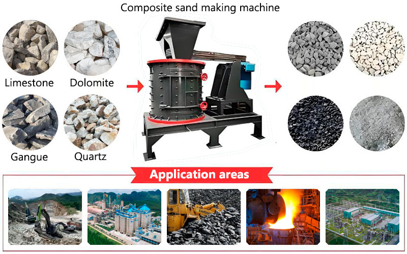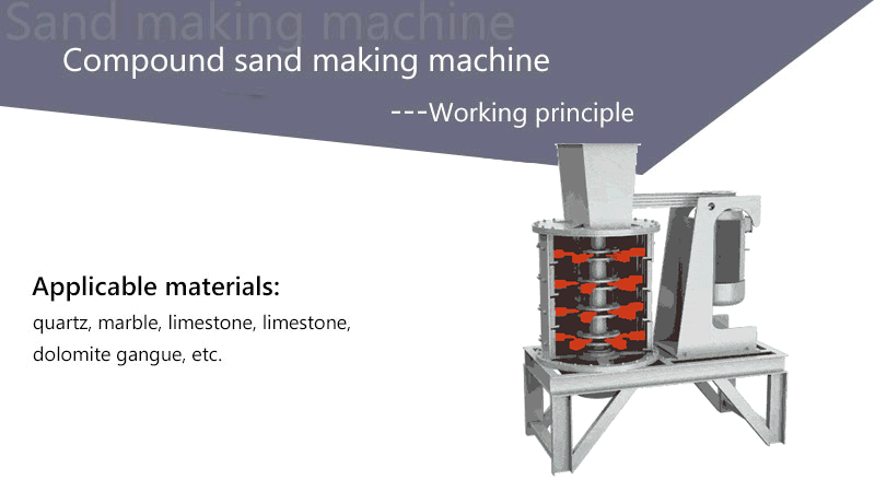 Compound sand making machine, also known as compound crusher, is a kind of small and medium-capacity sand making equipment. The material enters the crushing chamber from above. The high-speed rotating hammer impacts and crushes the ore and throws the stone to the lining plate. The stone and stone are , hammer head, lining plate and other multiple parties collide and rub to achieve the effect of crushing and making sand.