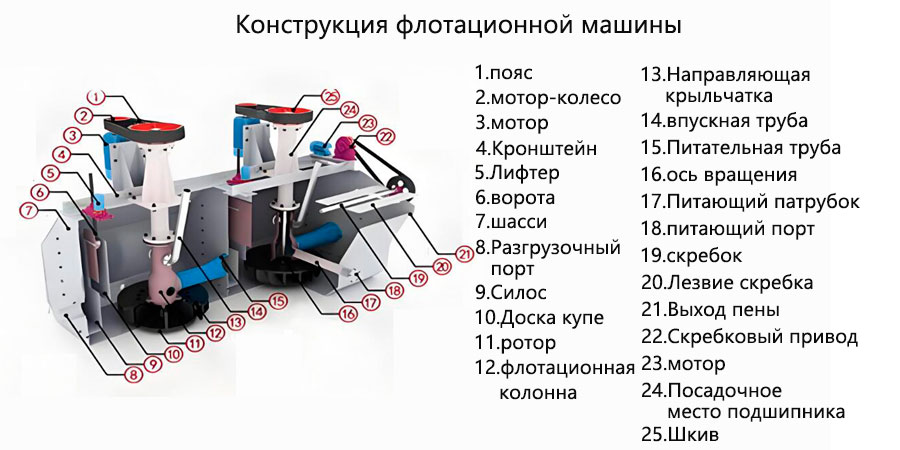 The flotation machine is mainly composed of a flotation chamber, a mixing device, an aeration device, a mineralized foam discharge device, a motor, etc.