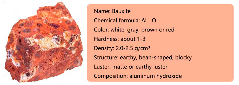 Bauxite is a sedimentary rock rich in aluminum, mainly composed of various mixtures of aluminum oxide and hydroxide and silicon dioxide, and is the main source of aluminum production. Its chemical composition is mainly aluminum oxide, and it is a white, red, yellow or brown amorphous clay-like substance, generally containing impurities such as iron oxide.