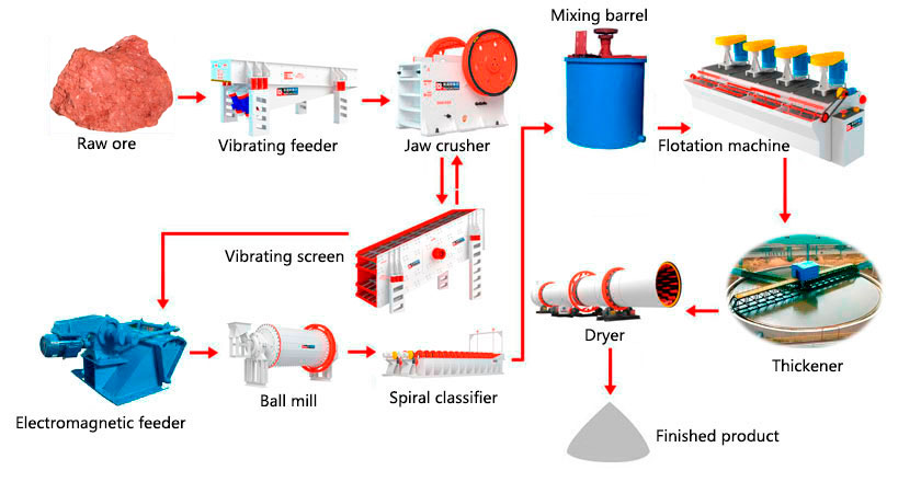 Flotation process equipment includes jaw crusher, vibrating screen, ball mill, classifier, mixing tank, flotation machine, concentrator, dryer, etc.