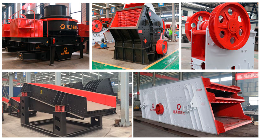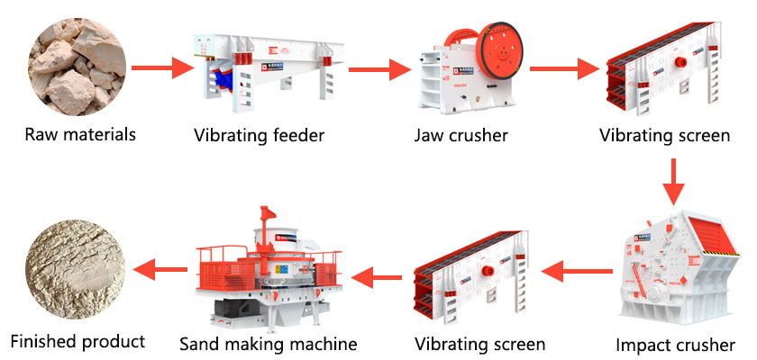 Main equipment: vibrating feeder, jaw crusher, vibrating screen, impact crusher, sand making machine, etc.