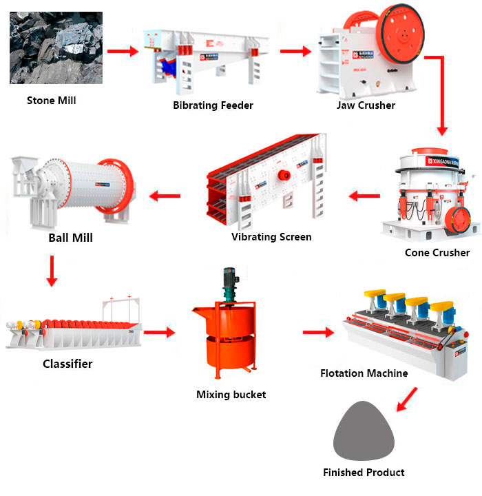 Generally, jaw crushers are used for coarse crushing of crystalline and amorphous graphite ores, and cone crushers or hammer crushers are used for medium and fine crushing; wet ball mills and grid-type ball mills are used for grinding; JJF and XCF are commonly used for graphite flotation. Type, XJB type flotation machine; hydrocyclone or belt filter is commonly used for graphite ore beneficiation and dehydration.