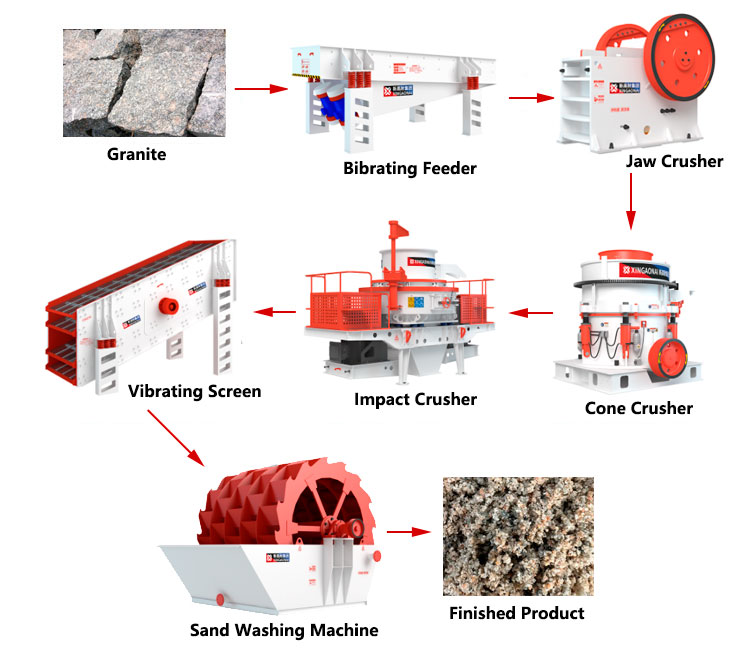 [Process introduction]:The processing of granite is divided into four stages: coarse crushing of the jaw crusher, medium and fine crushing of the impact crusher or cone crusher and sand shaping and packaging of the sand making machine.