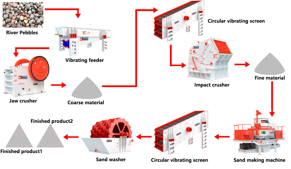 Large river pebbles are uniformly fed by the vibrating feeder through the bin and transported to the jaw crusher for coarse crushing. After coarse crushing, the river pebbles are screened by the vibrating screen and transported by the belt conveyor to the impact crusher or cone crusher for fine crushing.